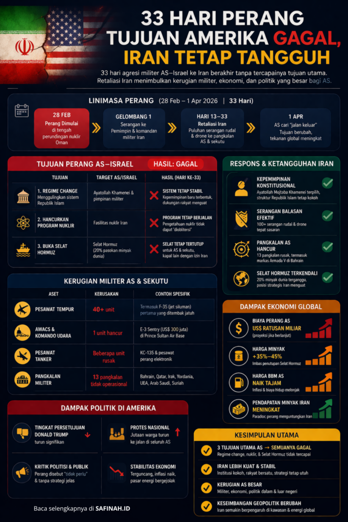 Pada akhirnya, posisi Amerika berubah drastis. Mengamankan Selat Hormuz tidak lagi menjadi prioritas utama. Ini menandai kegagalan strategis yang signifikan, sekaligus menunjukkan inkonsistensi dalam tujuan perang sejak hari pertama hingga hari ke-33.