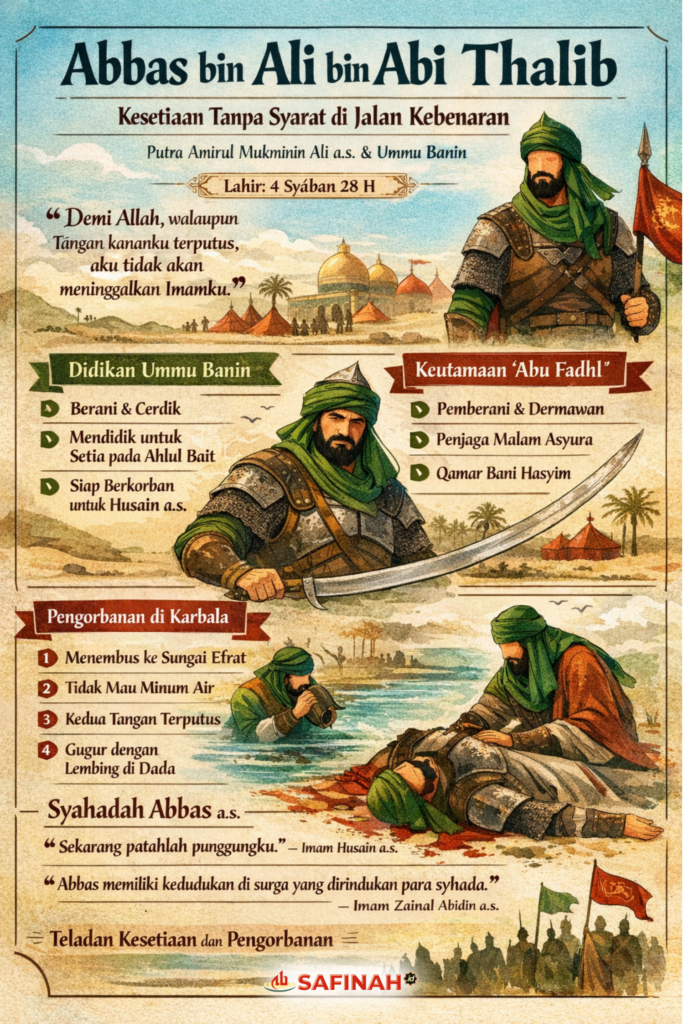 Di antara nama-nama besar Karbala, Abbas bin Ali menempati posisi yang unik. Ia bukan imam, tetapi kehadirannya menjadi penopang imamah. Ia bukan pemimpin pasukan, tetapi tanpanya barisan kebenaran terasa runtuh. Abbas adalah wajah kesetiaan murni—kesetiaan yang tidak menawar, tidak menghitung untung-rugi, dan tidak mundur walau tubuh hancur.