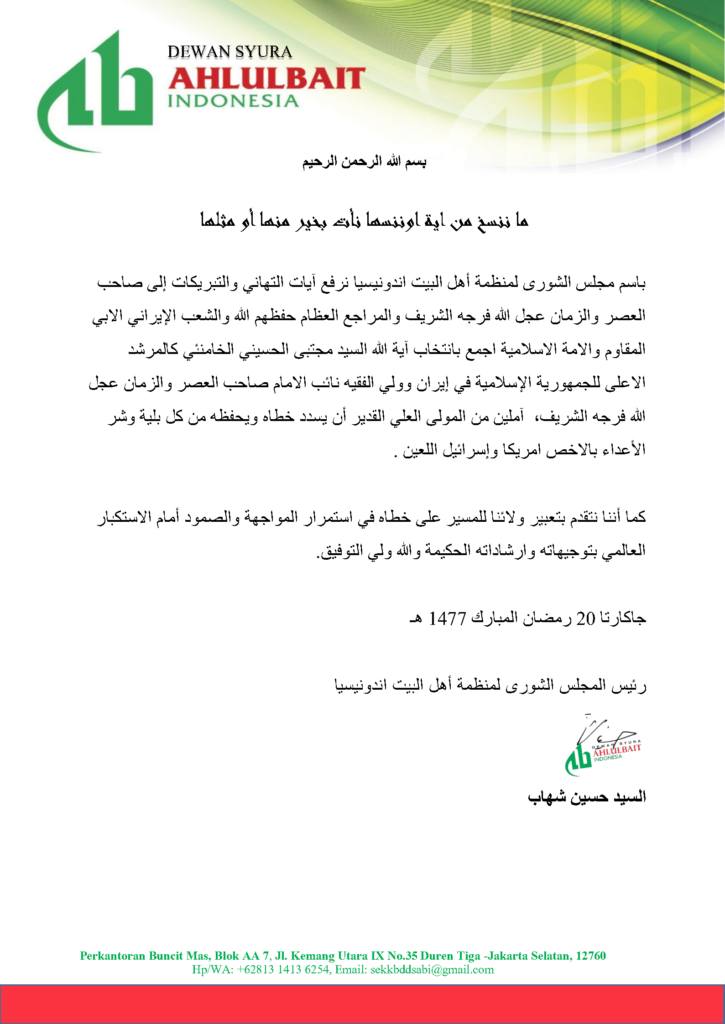 Atas nama Dewan Syura Organisasi Ahlulbait Indonesia, kami menghaturkan untaian ucapan selamat dan tahniah yang sangat tinggi kepada Imam Zaman (ajjalallahu ta’ala farajahusy syarif), para marja’ agung (semoga Allah menjaga kehadiran mereka) dan seluruh bangsa Iran yang senantiasa teguh dalam perlawanan atas terpilihnya Ayatullah Sayyid Mujtaba Hosseini Khamenei sebagai Pemimpin Tertinggi di Republik Islam Iran dan Wali Faqih yang merupakan wakil dari Imam Zaman (ajjalallahu farajah). Kami memanjatkan doa ke hadirat Allah SWT, Yang Maha Tinggi lagi Maha Kuasa, semoga beliau senantiasa mendapat bimbingan dan petunjuk, dilindungi dari segala marabahaya dan keburukan musuh-musuh, khususnya Amerika Serikat dan Israel yang terkutuk.
