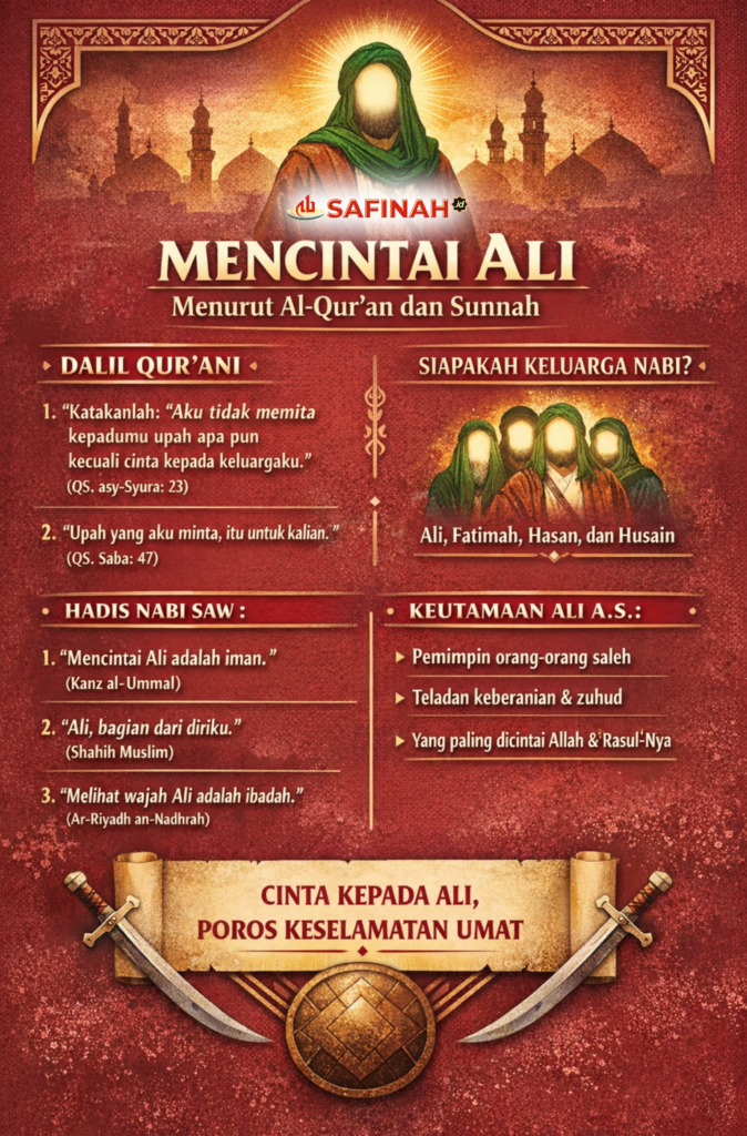 Mencintai Ali bin Abi Thalib as bukanlah slogan emosional atau identitas mazhab semata. Ia adalah perintah Al-Qur’an, teladan Nabi, dan poros keselamatan umat. Cinta ini melahirkan keberpihakan pada keadilan, keberanian melawan tirani, dan kesetiaan mutlak kepada kebenaran.