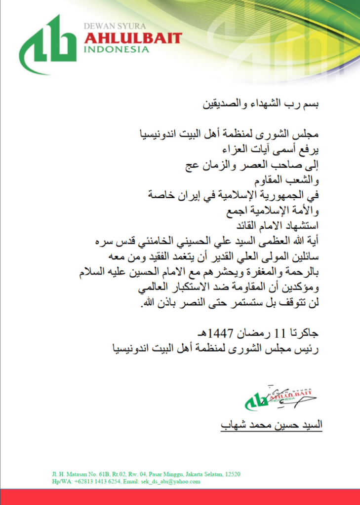 Dewan Syura ABI menegaskan bahwa kesyahidan Imam Khamenei oleh AS dan Zionis merupakan kejahatan luar biasa terhadap kemanusiaan dan bentuk paling telanjang dari terorisme negara. Tindakan ini tidak akan memadamkan cahaya perjuangan, melainkan justru menguatkan tekad umat untuk berdiri melawan kezaliman global.