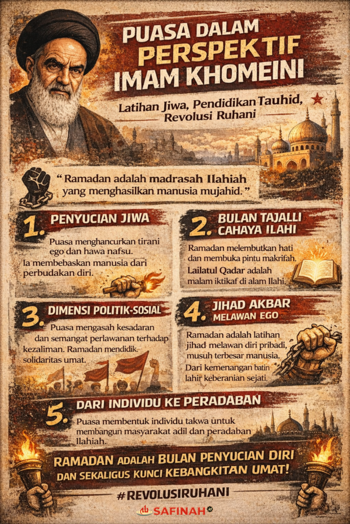 Sebagai pemimpin Revolusi Islam, Imam Khomeini tidak memisahkan spiritualitas dari perjuangan sosial. Puasa membentuk manusia yang sabar, disiplin, dan tahan tekanan—karakter yang dibutuhkan dalam perlawanan terhadap kezaliman.